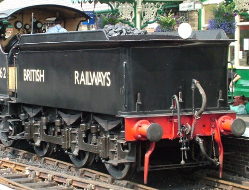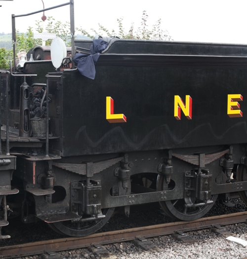 The 2640 gallon tender was introduced on the GER by J. Holden but initially the design continued to use the earlier Worsdell chassis design. Later 2640 gallon tenders had a Holden chassis. During the last overhaul completed in 2014 the tender was turned out in original GER condition including removal of the coal fenders and the addition of safety chains on the rear buffer beam. The photos show the tender before this work was carried out. When purchased for preservation the tender numberplate had already been removed so the original identity is not confirmed though the last known tender with 65464 was number 7543. Yeadon's Register of LNER Locomotives Appendix 2 says that GER tenders carried the same number as the engine with the year in which the tender was built cast on the plate. The current numberplate attached is not the correct identity for this tender but is representational of the locomotives appearence in GER ownership. |