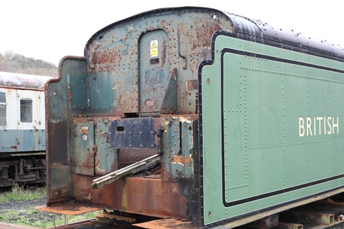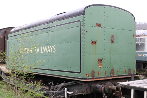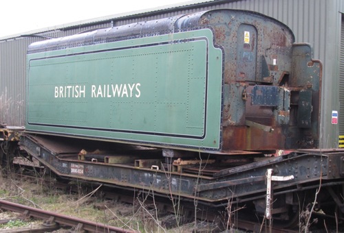 This is the original tank from 5000 gallon High Sided Non Corridor tender no 724 which during preservation was used with LNER A2 class 4-6-2 no. 60532. A new tank was fitted circa 2022 and the original tank is currently (March 2023) stored on wagon DB904524 at Peak Rail's Rowley site. Nothing is known about what the owner intends to do with it in the future. |