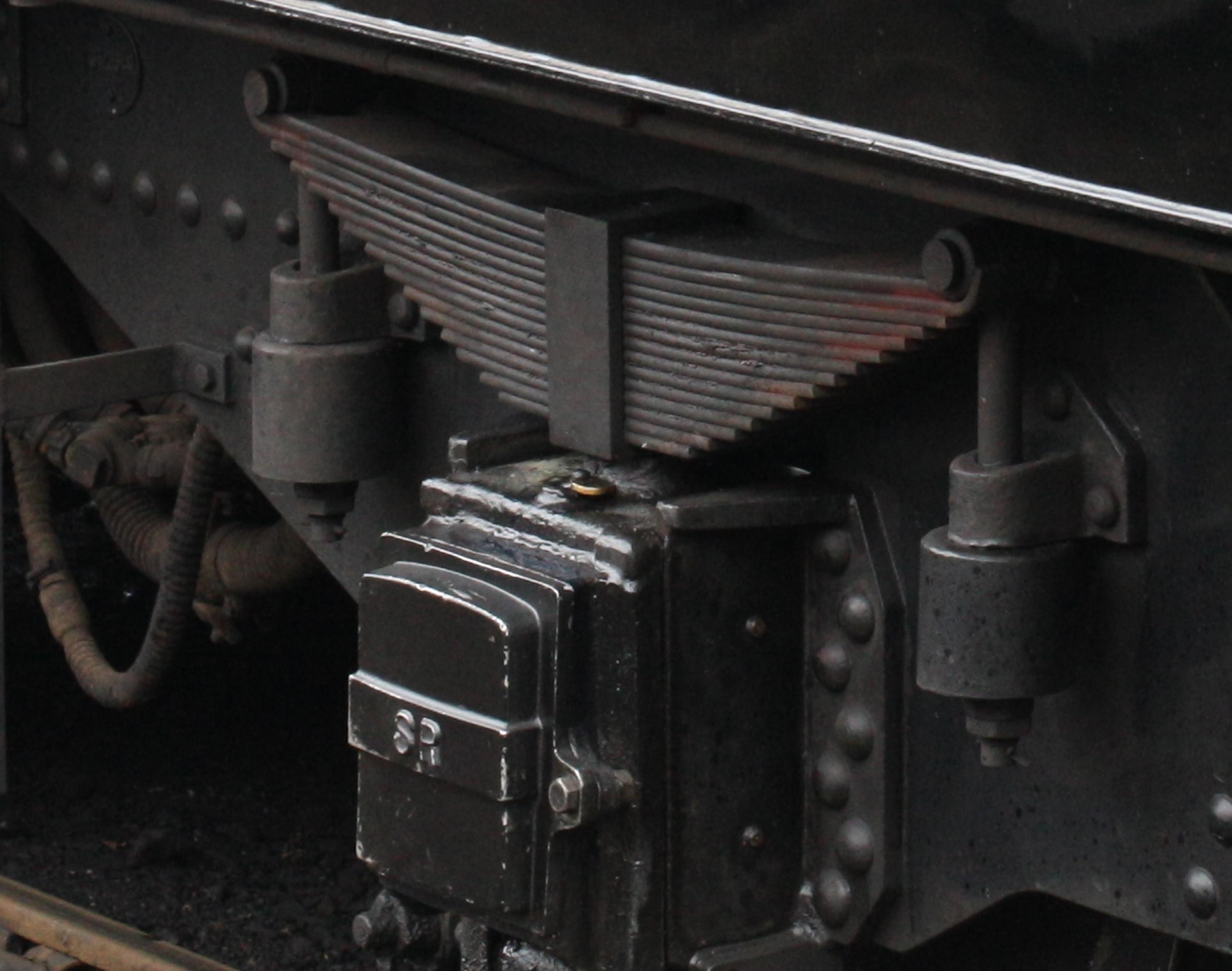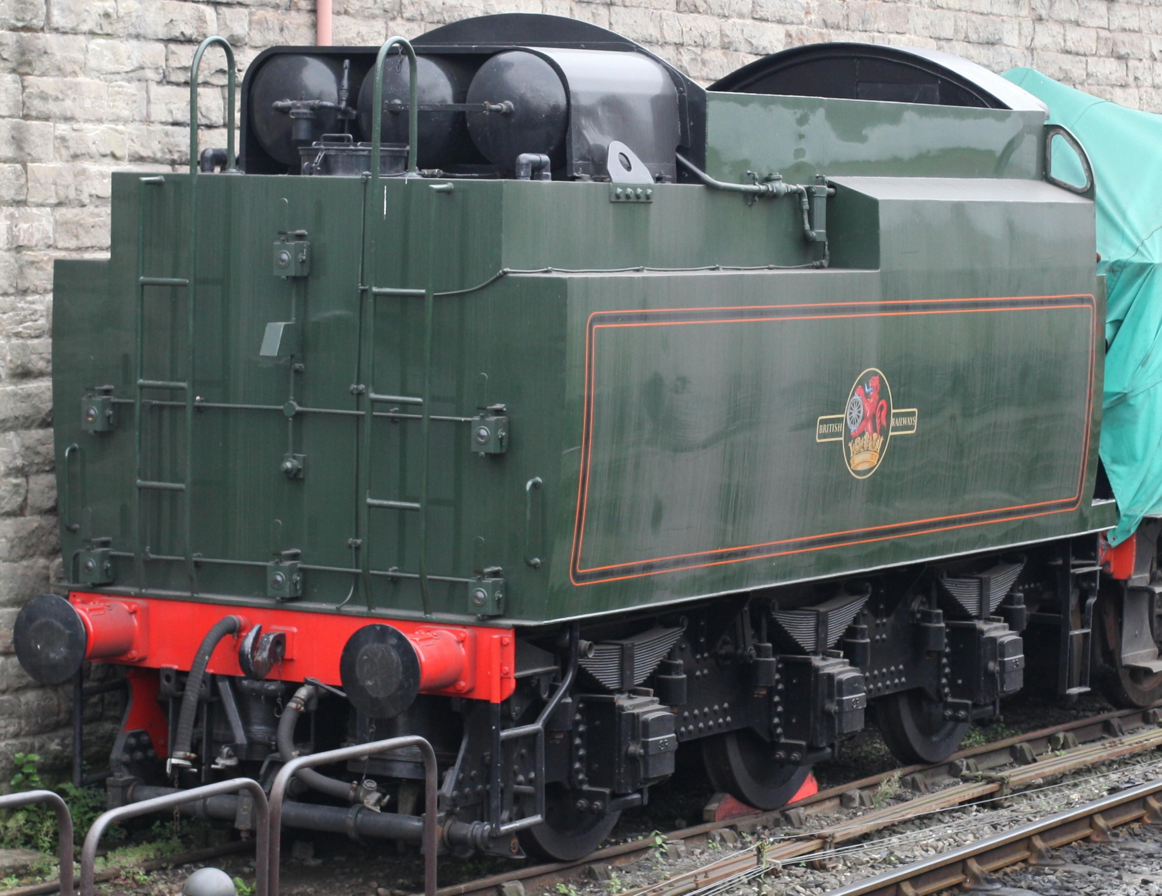 This is a new build tender completed in 1983 to the Bulleid 5500 gallon pattern. The tank does not have raves fitted. The wheels, axleboxes and springs were from an LNER tender. When built it was fitted with spoked wheels but these were replaced with disc wheels on the original axles circa 1990. At the same time the coal bunker was extended to increase coal capacity and the tender ran in this condition for many years. During the current overhaul started in 2024 the coal bunker is being altered back to the original size for a Bulleid 5500 gallon tender. |