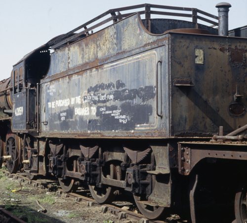 This tender is a bit of a mystery. It has Midland Railway Johnson frames but the last tender allocated to 42859 on the loco and tender record cards is a Fowler 3500 gallon no. 3563 listed as built in 1925 by North British Locomotive Co. It would be expected that the tender would be all new construction and the record card does not list it as reusing old frames. John Jennison’s article on LMS 3500 gallon tenders in LMS Review No. 1 also doesn’t list it as having old frames. The most obvious explanation would be an undocumented tender exchange in the latter days of BR steam. However there is photographic evidence that this tender had Johnson frames in the early 1950's. A possible explanation is a frame swap that hasn't been documented. The engine entered and left Barry scrapyard with the same tender.Tank and frame are currently separated. The frame was removed to an unknown location in December 2012 and may have been scrapped but the situation is unclear. Tank was at Binbrook Airfield but was moved to a different unknown location by November 2013. The frames of the locomotive are at The East Lancashire Railway. The picture above is an undated image taken at Woodham Bros, Barry. |