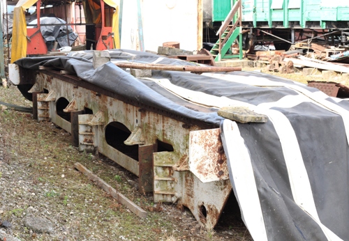 Tender number is based on the last tender shown as allocated to this loco by BR records. Original tank was of welded construction this has now been scrapped. The frames require a new front dragbox, inner frames and stretchers. New inner frames have been profiled and new stretchers constructed. The new tank when built will be of all welded construction. Parts for the water scoop survive but it is not intended to refit it. The top photo, which is undated, was taken while the tender was at Woodham Bros, Barry. The second photo shows the frames in 2024. |